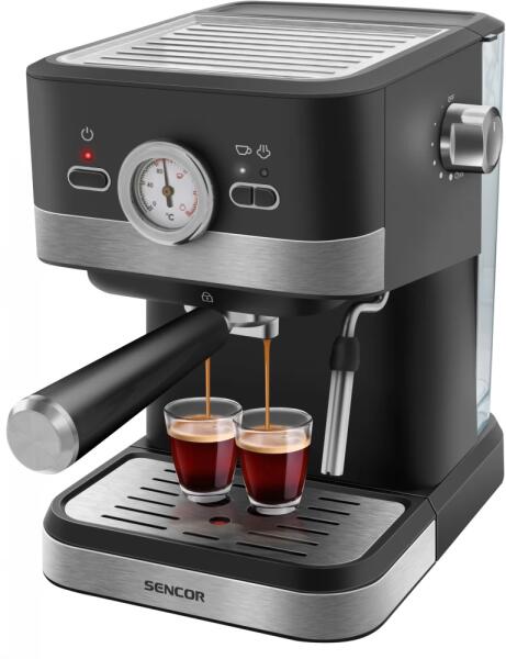 • A Sencor SES 1721BK karos presszó kávéfőző géppel könnyedén készítheti el a kedvenc eszpresszóját. A 20 bar nyomás garantálja az ízletes és intenzív kávéélményt. Az elforgatható rozsdamentes gőzfúvóka lehetővé teszi a krémes cappuccino és latte készítését. Emellett a készülék forró víz funkciójával akár americano vagy tea is elkészíthető. A kivehető 1,5 literes víztartály vízmennyiség jelzővel rendelkezik, így mindig pontosan tudja, hogy mikor kell feltölteni. A digitális vezérlés a pontosabb működést hivatott biztosítani.